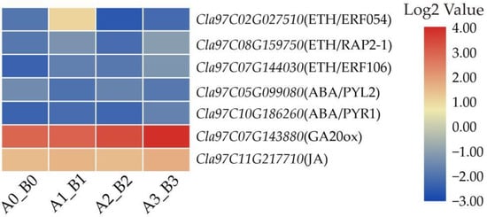 Heatmaps of DEGs related to phytohormones. Each row represented four comparison groups (A0_B0, A1_B1, A2_B2 and A3_B3) from left to right. The log2|A/B| was colored using TBtools: red color indicated the DEG was up-regulated, and blue color indicated it was down-regulated.