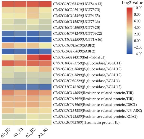 UDP-glucoronosyl/UDP-glucosyl transferase (UGT) participates in the hypersensitive reaction of plants by synthesizing some resistant substances, such as scopoletin glucoside, scopoletin and betacyanins [,,]. In our data, we identified seven UGT genes, and five of them were up-regulated (Figure 8). One up-regulated gene encoding the Bet v1 family protein (Cla97C06G114310) was also identified. Under M. incognita infection, pathogenesis-related proteins rapidly accumulate, including five β-glucosidase and five resistance-related proteins, and all of them except Cla97C11G216160 were up-regulated. Thaumatin protein (Cla97C03G062100) was involved in defense responses regulated by salicylic acid (SA), and the protein was expressed in a pattern similar to the gene that encodes SA binding protein (Cla97C01G015610).