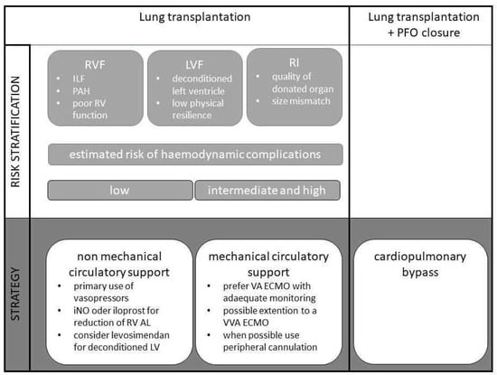 This review article therefore aims to summarise the current trends of non-mechanical and mechanical circulatory support (MCS) during lung transplantation in an accentuated manner and to reflect the current status of the respective evidence. Focusing on the exemplary but also frequent complications of right ventricular failure (RVF), impairment of left ventricular function (left ventricular failure (LVF)) and RI, the pathophysiology, frequency of occurrence, and known risk factors are first discussed [12,13]. This and possible therapeutic strategies will be discussed on the basis of data from the current literature and especially against the background of the international consensus recommendations for anaesthesiologic and intensive care management of lung transplantation published in 2021 [12,14].