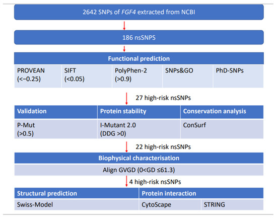 3.1. Predicting Deleterious nsSNPs of FGF4