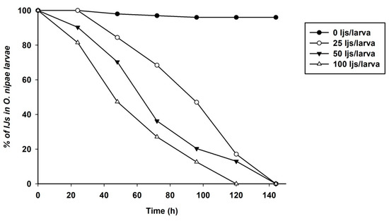 We previously evaluated the pathogenicity of S. carpocapsae at different concentrations by plotting the survival curve at different time points [19]. Significant differences in survival of O. nipae larvae at different concentrations were reported and at 24 and 48 h post-treatments [19]. In this study, the pathogenicity of H. bacteriophora on the survival of O. nipae larvae was evaluated. The results showed that the survival ability of O. nipae larvae was significant at different time points and H. bacteriophora IJs concentrations (χ2 = 42.170, df = 4, p = 0.001, Log-Rank Test). The O. nipae larvae survived for 140 h longer at lower concentrations of 25 and 50 IJs/larva than at 100 IJs/larvae, as shown in Figure 1.