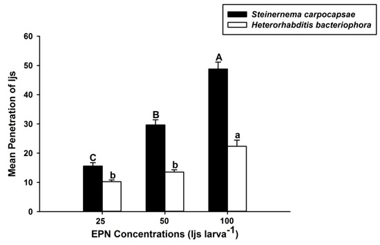 Mean penetration of infective juveniles of Heterorhabditis bacteriophora and Steinernema carpocapsae at different concentrations into third instars of Octodonta nipae. Means with the same letter are not significantly different, capital letters represent means of S. carpocapsae penetration, lowercase letters represent means of H. bacteriophora penetration.