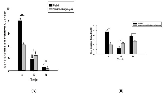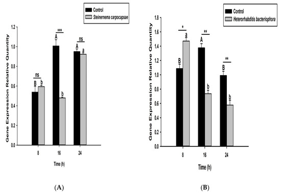Transcription of Serine Protease P56 (SPP56) gene in O. nipae larvae infected with (A) S. carpocapsae and (B) H. bacteriophora at 8, 16, and 24 h after treatments. Error bars labeled with different letters are significantly different (one-way ANOVA followed by LSD test, p < 0.05). The asterisks *** (p < 0.0001); ** (p < 0.001); * (p < 0.01) indicates different significant levels between the control and nematode treatments at the indicated time period, while “ns” indicates no significant difference.