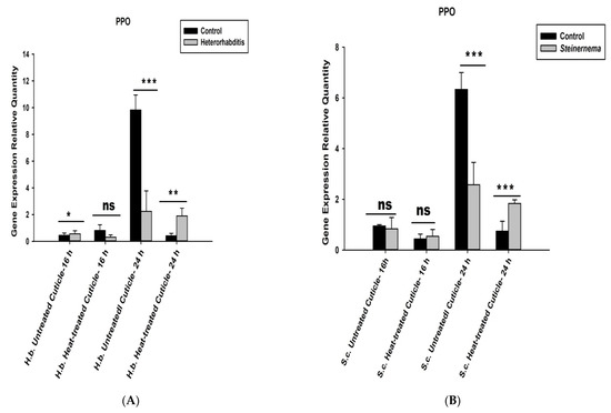 The expression level of O. nipae PPO gene challenged with nematodes isolated cuticles was generally low compared to the control treatment. The mRNA level of the PPO gene was insignificantly regulated at 16 h (t2 = 1.28, p = 0.272 ns) but significantly downregulated at 24 h (t2 = 1.817, p = 0.001) after injection of the isolated cuticles from the two nematodes (Figure 7). To further confirm this, we subjected the isolated cuticles to heat treatment at 100 °C for 20 min and injected them into the larvae as described above. The results establish that the expression levels of PPO gene are higher than the controls, especially at late hours after injection in both treatments. A significant increase in mRNA level of PPO gene was obtained at 24 h post-H. bacteriophora (t2 = 2.93, p = 0.030) and S. carpocapsae (t2 = 1.31, p = 0.001) heat-treated cuticles injections. At 16 h after injection of S. carpocapsae cuticle, insignificance (t2 = 1.27, p = 0.152) upregulation of PPO gene was recorded (Figure 7A,B).
