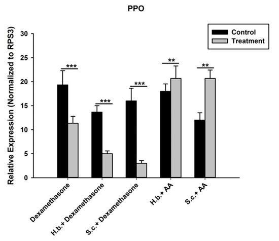 Influence of DEX and nematodes plus DEX, on expression of prophenoloxidase (PPO) gene in O. nipae larvae. AA rescues DEX and nematodes plus DEX-suppressed expression of PPO gene in O. nipae larvae. The asterisks *** (p < 0.0001); ** (p < 0.001); indicate different significant levels between the control and nematode treatments at the indicated time period.