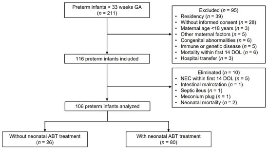 Flow diagram of preterm infants analyzed. Two hundred eleven preterm infants < 33 weeks gestational age were eligible to participate in the study. Ninety-five neonates were excluded, 116 neonates were included, and 10 neonates were eliminated, resulting in 106 neonates analyzed of which 26 were not treated with antibiotics, and 80 were treated with antibiotics during the neonatal period. GA (gestational age), n (number), DOL (day of life), ABT (antibiotic).