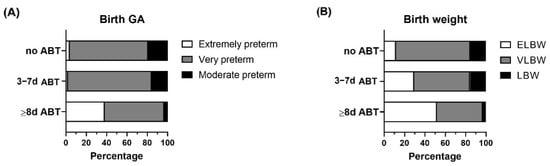 Birth gestational age and birth weight categorization within the study groups. Preterm infants < 33 weeks gestational age (GA) were classified according to neonatal antibiotic treatment days in 3 groups: no antibiotics (no ABT, n = 26), three to seven antibiotic days (3–7 d ABT, n = 51), and eight or more antibiotic days (≥8 d ABT, n = 29). (A) Birth GA classification (extremely preterm, very preterm, moderate preterm), (B) Birth weight classification, extremely low birth weight (ELBW), very low birth weight (VLBW), low birth weight (LBW).