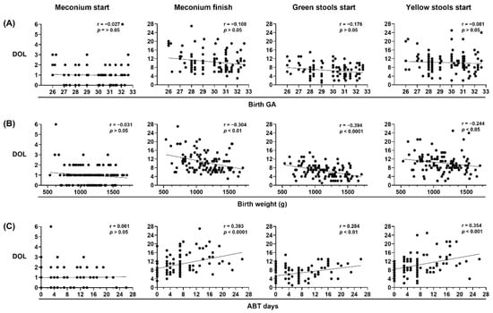 Birth weight and neonatal antibiotic treatment are major contributors to neonatal stool pattern in preterm infants. Neonatal stool pattern from preterm infants < 33 weeks gestational age (GA) at birth (n = 106). Day of life (DOL) on which meconium started, meconium finished, green stools started, and yellow stools started were compared with (A) birth GA, (B) birth weight in grams (g), and (C) antibiotic (ABT) days administered during neonatal period. Simple linear regression analysis; Spearman correlation (r) and p-values (p) are shown.