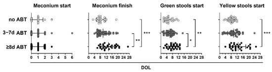 Neonatal antibiotic treatment equal to or greater than 8 days delay in meconium finish, green start, and yellow start stools in preterm infants. Preterm infants < 33 weeks gestational age (GA) were classified according to neonatal antibiotic treatment days in three groups: no antibiotics (no ABT, white circles, n = 26), three to seven antibiotic days (3–7 d ABT, gray circles, n = 51), and eight or more antibiotic days (≥8 d ABT, black circles n = 29). The day of life (DOL) in which meconium started, meconium finished, green stools started, and yellow stools started is shown. Kruskal–Wallis test with Dunn’s post hoc test, p < 0.05 (*), p < 0.01 (**), p < 0.001 (***).