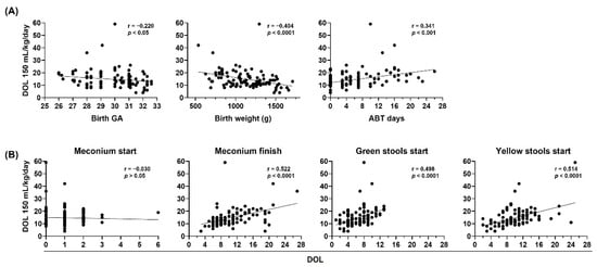 Afterwards, we sought to determine the influence of birth GA, birth weight, neonatal antibiotic treatment days, and stool pattern on the DOL in which preterm infants reached 150 mL/kg/day enteral feeds (Figure 5). Our results showed that birth GA and birth weight versus neonatal antibiotic treatment days, inversely and directly correlated with oral tolerance, respectively (Figure 5A). In addition, the DOL on which meconium finished, green stools started, and yellow stools started directly correlated with oral tolerance (Figure 5B).