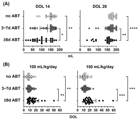 Finally, we analyzed the oral tolerance in the no ABT, 3–7 d ABT and ≥8 d ATB study groups (Figure 6). Preterm infants that did not receive neonatal antibiotic treatment and those who were treated with ATB for 3 to 7 days reached similar volumes in oral feeds at DOL 14 and 28 (Figure 6A), and reached 100 and 150 mL/kg/day in enteral feeds in similar DOL (Figure 6B). In contrast, preterm infants who were treated with ABT for 8 or more days, reached reduced volumes in oral feeds at DOL 14 and 28 (Figure 6A), and took longer to reach 100 and 150 mL/kg/day in enteral feeds (Figure 6B) than infants that did not receive ABTs or received 3 to 7 days of ABT treatment.