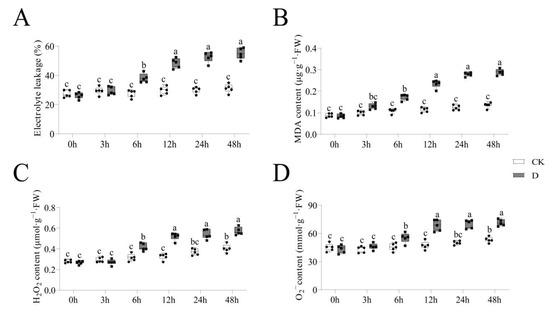 Figure 1. The indicators in membrane lipid peroxidation analysis at different time points under drought stress. The grey columns with black squares represent drought stress, while white columns with black circles represent CK treatment. The different lower-case letters above the columns denote significant differences (α = 0.05, LSD). (A) The trends of electrolyte leakage (El); (B) The trends of malondialdehyde (MDA); (C) The trends of electrolyte hydrogen peroxide (H2O2); (D) The trends of superoxide anion (O2).