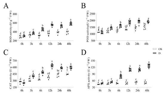 Figure 2. The indicators in reactive oxygen species (ROS) analysis at different time points under drought stress. The grey columns with black squares represent drought stress while white columns with black circles demonstrate CK treatment. The different lower-case letters above the columns show significant differences (α = 0.05, LSD). (A) The activity profile of superoxide dismutase (SOD); (B) The activity profile of peroxidase (POD); (C) The activity profile of electrolyte catalase (CAT); (D) The activity profile of ascorbate peroxidase (APX).