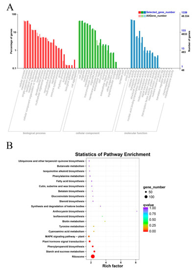 Figure 4. The GO and KEGG enrichment analysis of differentially expressed genes (DEGs) as shown by RNA-Seq analysis. (A) The GO enrichment analysis of the DEGs; the red, green and blue represent biological process, cellular component and molecular function, respectively; (B) The KEGG enrichment analysis of the DEGs, the circles from red to purple show the qvalues from low to high.