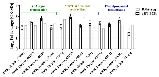 Figure 5. The qRT-PCR analysis of differentially expressed genes (DEGs). The gray pillars show the RNA-Seq expression analysis while the black pillars demonstrate the qRT-PCR expression profile. The green-head DEGs were enriched in abscisic acid (ABA) signal transduction pathway, the yellow-head DEGs were enriched in starch and sucrose metabolism pathway, while the blue-head DEGs were enriched in phenypropanoid biosynthesis pathway. The log2|Foldchange (CK vs. D)| value of more than 1 was used to denote differentially expressed genes (DEGs).