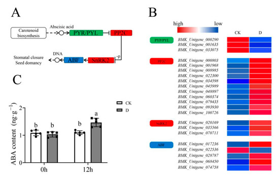 The plant hormone signal transduction pathway (ko04075) was enriched in both the GO and KEGG analyses. Similarly, the ABA channel was also enriched (Figure 6A), together with the DEGs as shown in Figure 6B. In addition, the data showed that the ABA content had increased significantly (p < 0.05) under drought stress (Figure 6C), which showed that the ABA-specific pathway was enriched in response to stress.