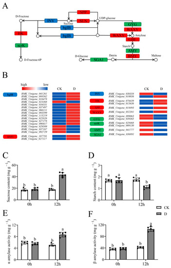 KEGG analysis showed that the starch and sucrose metabolism pathway (ko00500) was also enriched (Figure 7A). The expression of DEGs in the ko00500 pathway was significantly changed (Figure 7B). In addition, there was an increase in the sucrose content while the starch content was suppressed with the increasing activities significantly (p < 0.05) of alpha-amylase and beta-amylase (Figure 7C–F). Therefore, these results revealed that the starch and sucrose metabolism pathway was involved in responses to drought stress.