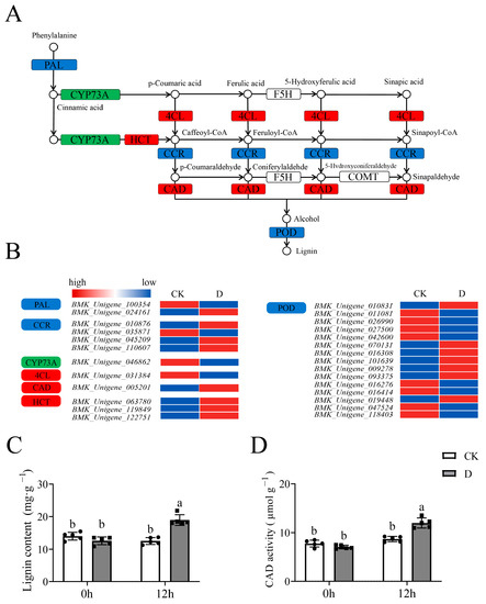 In addition, there was enrichment in phenylpropanoid biosynthesis pathway (ko00940) (Figure 8A), and the expression of DEGs in the ko00500 pathway had significant changes (Figure 8B). Similarly, lignin content had increased significantly (p < 0.05) and there were significant shifts (p < 0.05) in the activities of cinnamyl-alcohol dehydrogenase (CAD) (Figure 8C,D). These results revealed that phenylpropanoid biosynthesis was one of the pathways that mediates responses to stress.