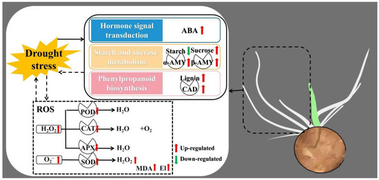 Drought stress is an important abiotic stress and a key limiting factor which negatively affect crop productivity, owing to the global water shortage [11]. Drought stress causes significant losses in agricultural productivity, desertification, soil erosion and ecological degradation [12]. In addition, drought stress contributes to changes in the physiology and metabolism of plants, which lead to substantial reductions in the yield [13]. Drought stress can suppress the leaf area and the total chlorophyll content, produce reactive oxygen species (ROS), make leaves wilt and restrict root growth [14,15]. In addition, drought stress can also modulate activities of many oxidation-protective enzymes such as peroxidase (POD), superoxide dismutase (SOD), catalase (CAT) and ascorbate peroxidase (APX) [16], as well as the expression of some genes whose functions are associated with stress [17]. On the other hand, drought stress accumulates abscisic acid (ABA) in plants, which regulates stomatal closure and defends plants from stress [18]. ABA could induce the starch and sucrose metabolism to enhance stress tolerance [19]. Although drought stress affects all plant growth and development stages, the bud stage is the most sensitive and affects subsequent plant growth periods [20].