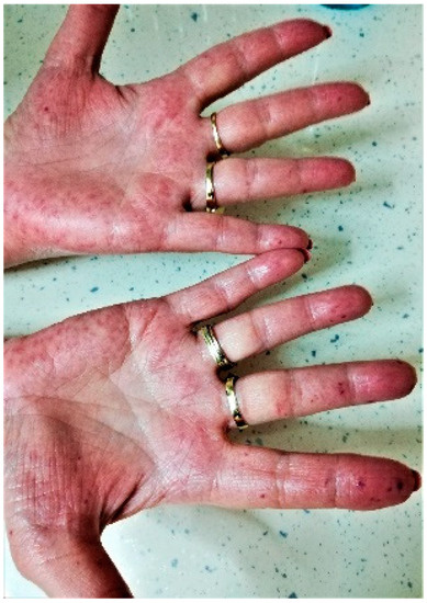 Figure 1. Multiple cutaneous telangiectasias on both hands—clinical presentation in February 2021.