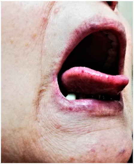 Figure 2. Mucosal telangiectasias at tongue and lips level—clinical presentation in February 2021.