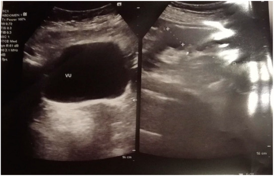Figure 3. Ultrasound image of bladder, with minimal post-void residue—February 2021 (VU = urinary bladder).