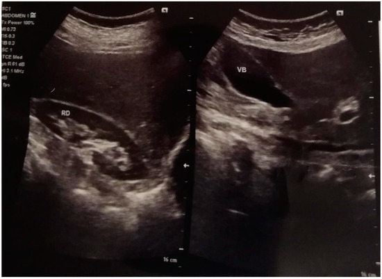Figure 4. Ultrasound image of renal microcysts in the right kidney and normal image of biliary bladder—February 2021 (RD = right kidney; VB = gallbladder).