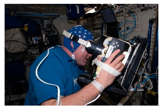 EEG will be essential for studying the unique risks of deep space on the CNS. On Earth, EEG can highlight abnormal brain activity due to epilepsy, head injury, stroke, or even brain tumors [24,25,26,27]. The “NEUROSPAT” project has demonstrated the potential of this technology on the ISS (Figure 1). It has confirmed changes in visuo-attentional activity, visuospatial performance, brain activity, and effects of space travel on sleep quantity [28,29,30,31]. EEG has also been used in space to measure changes in neurocognitive performance and brain activity that result from exposure to microgravity and isolation [27]. Changes in activity are commonly identified in the faster EEG frequencies (alpha and beta). Simulated microgravity environments, specifically during bed rest, see changes in theta and alpha waves, demonstrating inhibition of brain activity in the cortical regions under these conditions. Many of the changes in EEG activity may result from reduced sensorimotor input in simulated microgravity [32]. Findings also point to reduced sleep duration and slow-wave sleep (SWS) during spaceflight due to isolation and microgravity. Performance reductions are another issue in microgravity environments. Docking simulation tasks indicate an increase in global theta EEG oscillations while in space as compared to the same task on Earth. This was also associated with slower reaction times during the task, which has important implications for astronauts [33].