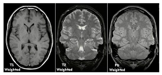 T1-weighted, T2-weighted, and proton density-weighted MRI images. Reproduced from https://en.wikipedia.org/wiki/Magnetic_resonance_imaging#/media/File:T1t2PD.jpg, accessed on 24 April 2022.