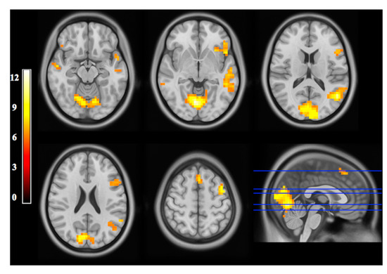 Functional MRI image. fMRI statistical maps of BOLD signal represented as axial slices. The bottom right image is a cluster-thresholder t-stat map. Doi:10.1371/journal.pone.0152614 (accessed on 24 April 2022).
