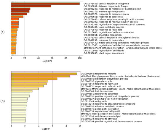Gene set enrichment analysis of hypoxia-inducible upregulated genes. (a) Meta-analysis of Arabidopsis; (b) Meta-analysis of rice using the corresponding Arabidopsis genes.