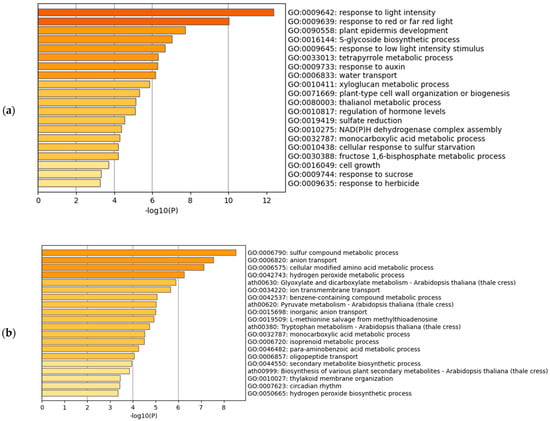Gene set enrichment analysis of hypoxia-inducible downregulated genes. (a) Meta-analysis of Arabidopsis; (b) Meta-analysis of rice using the corresponding Arabidopsis genes.