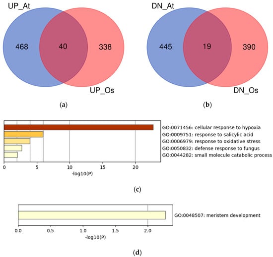 Analysis of the overlaps of upregulated or downregulated genes in Arabidopsis and rice using the Arabidopsis gene IDs. (a) Venn diagram of the upregulated genes in Arabidopsis (UP_At) and rice (UP_Os); (b) Venn diagram of the downregulated genes in Arabidopsis (DN_At) and rice (DN_Os); (c) Gene set enrichment analysis of the commonly upregulated genes; (d) Gene set enrichment analysis of the commonly downregulated genes.