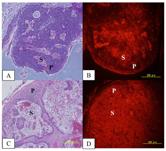 MID:BSA immunostaining in 2 different tumors, showing different microdistributions: (A,B) H&E of tumor 1 and its corresponding MID:BSA immunostaining; (C,D) H&E of tumor 2 and its corresponding MID:BSA immunostaining. A brighter image is indicative of a higher boron concentration. P: parenchyma; S: stroma.