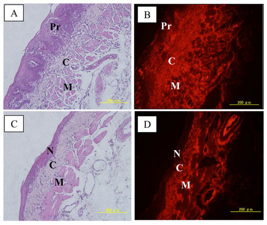 (A,B): H&E of a precancerous tissue with its corresponding immunostaining. (C,D) H&E of normal tissue with its corresponding immunostaining. A brighter image is indicative of a higher boron concentration. Pr: precancerous tissue; C: connective tissue; M: muscle; N: normal tissue.