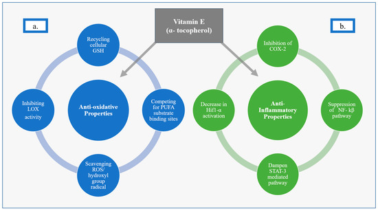 Anti-Oxidative and Anti-Inflammatory Properties of Vitamin E (α-tocopherol) (a) Anti-oxidative Properties of Vit E. (b) Anti-inflammatory Properties of Vit E.