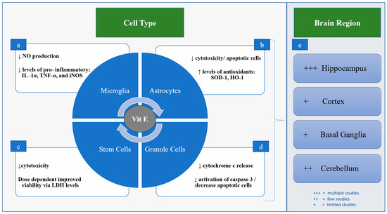Proposed Neuroprotective Mechanisms of Vit E. (a) In mice and rat microglia, Vit E dampens activation via decreased production of NO, IL-1α, TNF-α, and expression of iNOS. (b) In rat astrocytes, Vit E improves cell viability and increases levels of antioxidant enzymes heme oxygenase (HO)-1 and superoxide dismutase (SOD)-1. (c) In rat mesenchymal stem cells (MSCs) Vit E improves cell viability, decreasing LDH release in a dose-dependent manner. (d) In rat cerebellar granule cells Vit E inhibits cytochrome c release and decreases activation of caspase 3, resulting in fewer apoptotic cells. (e) Vit E’s role in neuroprotection has been examined most often in the hippocampus and cerebellum, with fewer studies looking at the cortex and basal ganglia.