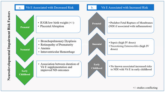 Vit E has been shown to be involved in implantation, development of the embryo, maturation of the placenta, and protection of the fetus against oxidative stress [11]. There is low placental transfer of Vit E, though the naturally occurring RRR- α-tocopherol form has been shown to move more readily across the placenta than the racemic α-tocopherol synthetic form [47]. When looking at Vit E supplementation during pregnancy, a 2008 Cochrane review found no benefit in mothers supplemented with antioxidant treatments, including Vit E, during pregnancy for incidence of prematurity, small for gestational age (SGA) birth, or pre-eclampsia compared to placebo; however, Vit E was not studied alone nor was it part of every regimen included in the meta-analysis [48]. A Cochrane review in 2015 examining the effect of Vit E supplementation in pregnancy on perinatal events found no benefit, except for decreased placental abruption. This analysis also found that Vit E appeared to increase pre-labor fetal rupture of membranes [49], which itself has been associated with neurodevelopmental impairment (NDI) [50] (Figure 3). However, subsequent smaller individual studies examining growth and Vit E have found that higher maternal levels of Vit E are associated with improved fetal growth [51], and low Vit E levels have been associated with SGA birth [52] (Figure 3). If Vit E does improve fetal growth, one major presumed mechanism would be that higher Vit E levels improve the ability to mitigate inflammatory and oxidative stressors in utero; however, better overall nutritional status may also play a role [51,52]. Since fetal growth restriction, which is associated with low Vit E levels, is a known risk for NDI [53,54], maintaining adequate maternal Vit E levels appears prudent in order to optimize neurodevelopmental potential.