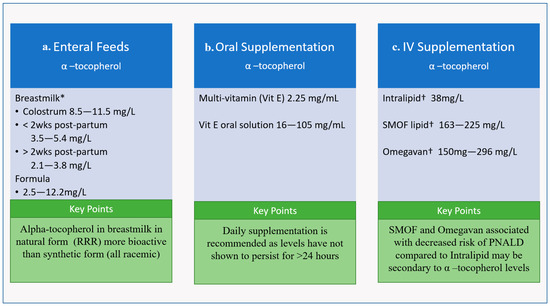 Current literature recommendations for α-tocopherol supplementation are 2.5–11 mg/kg/d for VLBWs and 2.5–3.5 mg/kg/d for term neonates [13,68]. Therefore, preterm neonates are frequently given oral or intravenous supplementation due to higher requirements. Infants on enteral feeds are supplemented with oral solution, either as a multi-vitamin that provides 2–3 mg/mL and/or different formulations of Vit E solution that provide 16–105 mg/mL to ensure adequate supply [11] (Figure 4). Vit E has been given to preterm neonates at doses up to 50 IU/kg (22.5 mg/kg); a study in 2013 gave a one-time 50 IU/kg dose of dl-α-tocopherol acetate enterally via nasogastric/orogastric tube at 4 h after birth and found increases in serum α-tocopherol levels within the outlined safety profile at 24 h, but these levels did not persist [6].