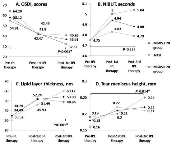 The improvement of mean OSDI scores (total, p < 0.001, paired t-test), mean lipid layer thickness (LLT) (total, p < 0.001, paired t-test), and mean tear meniscus height (TMH) (total, p = 0.014, paired t-test) after three sessions of IPL–MGX combined therapy in either two groups or totally. However, the improvement of mean noninvasive tear break-up time (NIBUT) was not significant (total, p = 0.333, paired t-test) but the values showed longer times after three sessions of IPL–MGX combined therapy. OSDI scores were overall higher in the MGXS ≤ 20 group (A). The mean NIBUT wasgradually improved in these three sessions in the MGXS ≤ 20 group but not inferior to pretreatment in the MGXS > 20 group. (B) The improvements of mean LLT werebetter after third treatments in the MGXS > 20 group (C). The improvements of mean TMH werebetter after third treatments in the MGXS ≤ 20 group (D). * means p < 0.05.