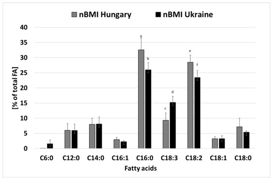Main fatty acids in breast milk of nBMI women from Ukraine and Hungary. FA—fatty acid; nBMI—women with normal BMI; C6:0—caproic acid; C12:0—lauric acid; C14:0—myristic acid; C16:0—palmitic acid; C18:0—stearic acid; C16:1—palmitoleic acid; C18:1—oleic acid; C18:2—linoleic acid; C18:3—α-linolenic acid; different letters show significant differences at p < 0.05 level.
