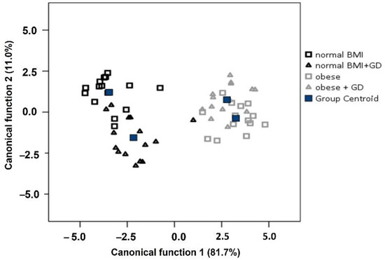 In a recently published paper, Covaciu et al. [78] underlined lactation stages as a function of fatty acid and elemental contents in order to identify the best discriminant markers. According to our results, 58.6% of the cross-validated samples were correctly classified into four groups: women with a normal BMI, women with a normal BMI and GD, obese women, and obese women with GD. The highest contribution to the separation and differentiation of the sample’s fatty acids was observed for C16:0 and C18:1, while C18:3 fatty acids were characteristic in the obese group. In the nBMI and nBMI+GD groups, mother’s milk arachidic, palmitic and tetracosanoic fatty acids had the highest discrimination coefficients.