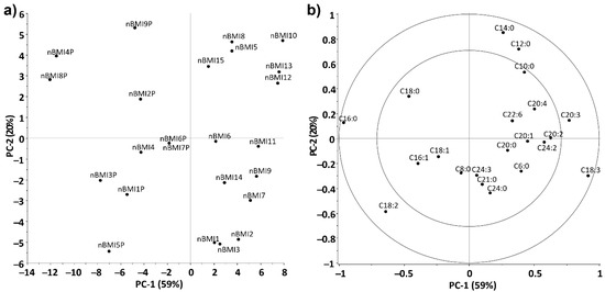 The FA profile of nBMI breast milk samples from Ukraine and Hungary was analyzed by PCA. The variance of the data set was described at 79% by using PC1 (59%) and PC2 (20%) (Figure 5a). PC1 was responsible for the separation of samples based on their origin (Ukraine or Hungary). The C16:0, C18:2, and C18:3 fatty acids had the greatest effect on the classification, as confirmed by the t-test results, as there was a significant difference between the measured amounts of the three fatty acids in the two groups. It is also important to note the role of C20:2 and C20:3, as these were more characteristic of the Ukrainian samples. According to the loading plot (Figure 5b), the distance between samples along PC2 was most affected by the amount of C10:0, C12:0, C14:0, and C18:2 fatty acids.