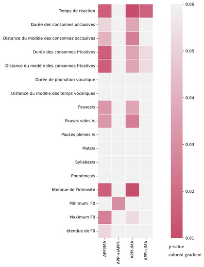 The figure represents a colored gradient of p-values for the significance of each acoustic parameter and each comparison according to statistical tests. It relates one acoustic parameter, named on the y-axis, with a comparison of two groups, named on the x-axis. According to the Mann–Whitney test, the difference between the two groups is considered as significant when the p-value is less than 0.05.
