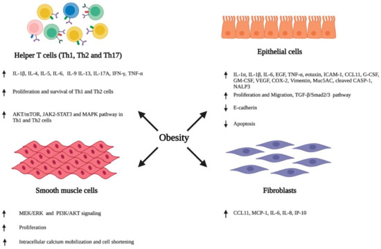 Various external stimuli, including environmental allergens and infectious agents, trigger an inflammatory response in the bronchial airway through the secretion of various cytokines and chemokines by the structural and immune cells of the airway. This promotes the infiltration of circulating immune cells, resulting in an inflammatory insult in the airway. Furthermore, airway cells also change their cellular phenotype and differentiate, consequently resulting in a series of events, such as the hypersecretion of inflammatory cytokines, airway wall thickening, subepithelial fibrosis, increased neovascularization, and enhanced proliferation and hypertrophy of smooth muscle cells, leading to the impairment and obstruction of the airway [2,44,45]. Recent studies have reported that obesity plays a detrimental role in modulating the phenotypes of airway immune and other structural cells, consequently resulting in the inflammation, hyperresponsiveness, and structural remodeling of the airway (Figure 1).