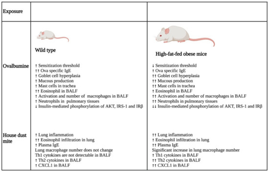 - Dietze, J.; Böcking, C.; Heverhagen, J.T.; Voelker, M.N.; Renz, H. Obesity lowers the threshold of allergic sensitization and augments airway eosinophilia in a mouse model of asthma. Allergy 2012, 67, 1519–1529. [Google Scholar] [CrossRef]