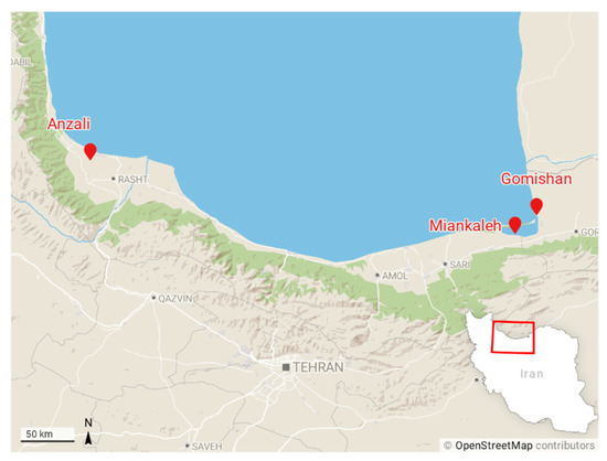 Sampling locations of common carp across the southern coasts of the Caspian Sea. Gomishan (E: 53°29′, N: 37°51′), Miankaleh (E: 53°30′, N: 36°52′), Anzali (E: 49°26′, N: 37°25′), and farm center at Sijoval (E: 54°07′, N: 36°53′).