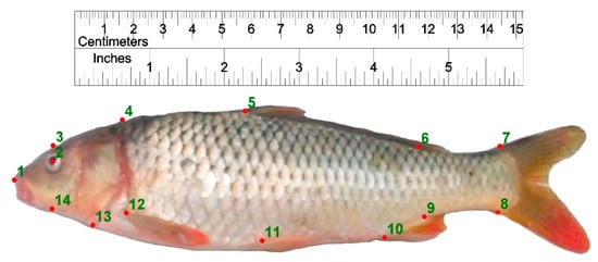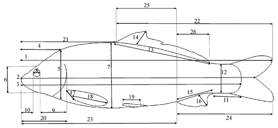 The traditional morphometric (TMM) data, including 26 features (Figure 2), were extracted using the ImageJ Software Version 1.45s, Bethesda, MD, USA [32]. To minimize the effect of fish size on the measured morphometric characters, the allometric method of the PAST Software Version 2.17c, Oslo, Norway [33] was used on the raw morphometric data [34].