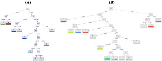 Decision tree generated models ((A) based on TMM and (B) based on geomorph) showing segregation between populations of common carp (A—Anzali lagoon; P—farmed population; M—Miankaleh; G—Gomishan).