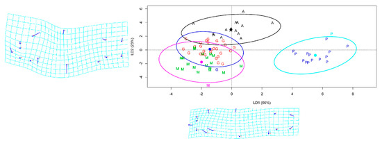 The LDA method [44] tries to separate two or more target classes by linear features. The resulting linear classifier made of combination features is used to discriminate variables between two or more naturally occurring groups, whether with a descriptive or a predictive objective. The same 11 datasets mentioned above were fed into this model and calculated its accuracy performance. The LDA on geomorph data was per-192 formed using the Morpho J software version 1.02.